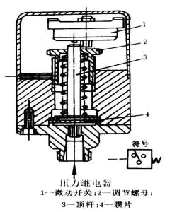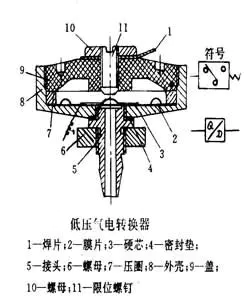 左圖所示為低壓氣電轉(zhuǎn)換器,硬芯3和焊片1是兩個(gè)觸點(diǎn),無(wú)氣信號(hào)輸入時(shí)是斷開的。有一定壓力氣信號(hào)輸入時(shí),膜片2向上運(yùn)動(dòng)帶動(dòng)硬芯3和限位螺釘11接觸、與焊片1接通,發(fā)出電信號(hào);氣信號(hào)消失時(shí),膜片帶動(dòng)硬芯復(fù)位,觸點(diǎn)斷開,電信號(hào)消失。調(diào)節(jié)螺釘11可以調(diào)整接受氣信號(hào)壓力的大小。右圖所示為壓力繼電器的工作原理固,輸入氣信號(hào)使膜片4受壓變形去推動(dòng)*桿3啟動(dòng)微動(dòng)開關(guān)1,輸出電信號(hào)。輸入氣信號(hào)消失,膜片4復(fù)位,*桿在彈簧作用下下移,脫離微動(dòng)開關(guān)。調(diào)節(jié)螺母2可以改變接受氣信號(hào)的壓力值。其結(jié)構(gòu)簡(jiǎn)單,制造容易,應(yīng)用廣泛。
